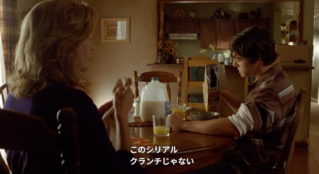 「このシリアル、クランチじゃない」とジュニアが文句を言っています。ちなみに、牛乳は日本のような1リットル入りの紙パックではなく、もっと大きなプラスチックのボトルに入っています。