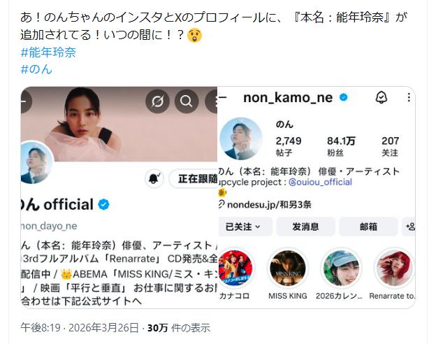 今回話題になっているのは、のんさんがX上で「能年玲奈」という本名に触れたことです。
