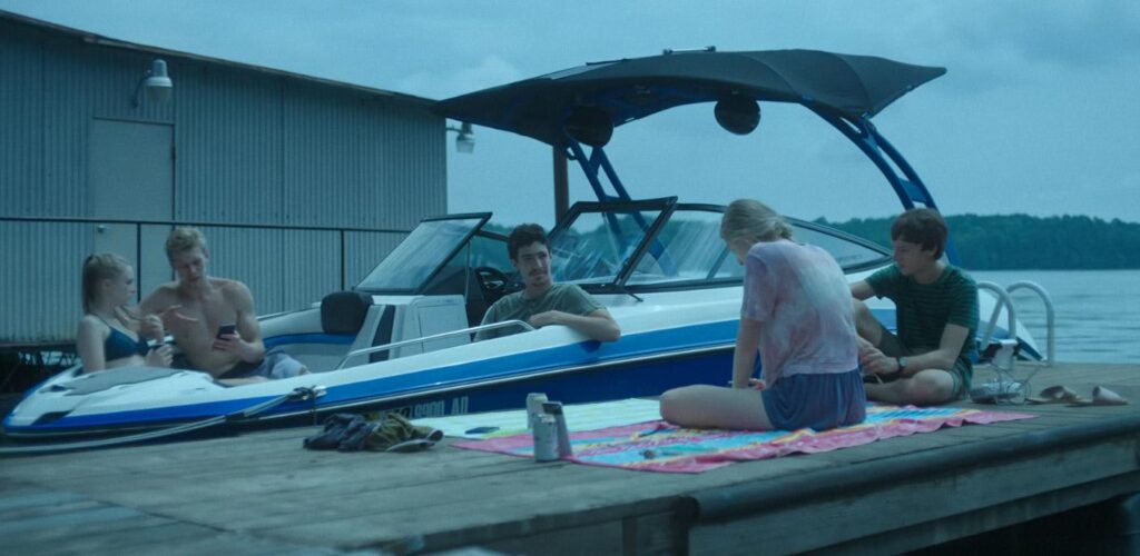 シャーロットとエリンは桟橋で日焼けを楽しんでいた。そばではジョナがドローンで遊んでいる。